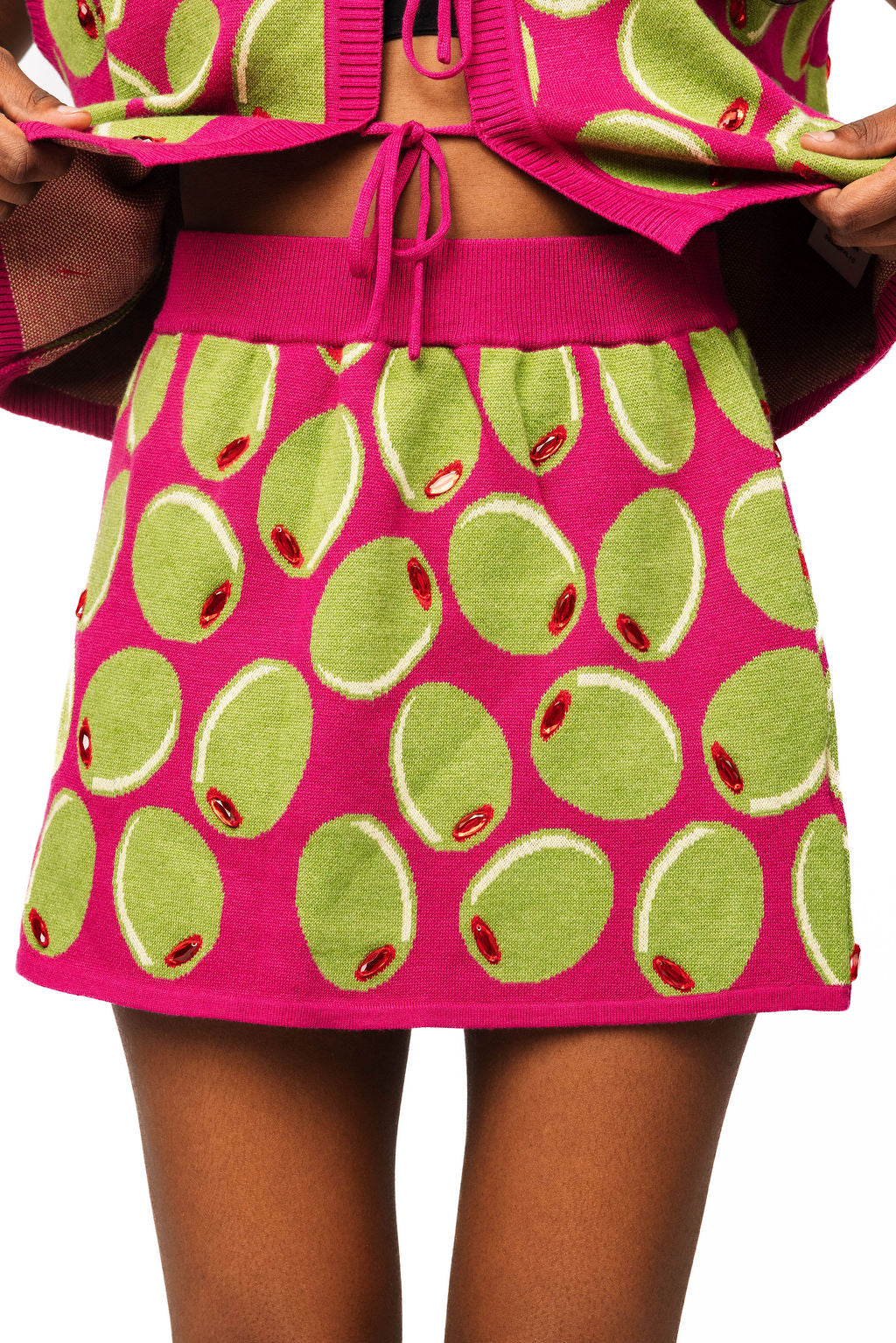 Strut your stuff in this delightfully quirky sweater skirt that's equal parts cozy and cheeky. Featuring a vibrant fuchsia base adorned with whimsical olive motifs and sparkly jeweled pits, it's the kind of piece that makes a statement without taking itself too seriously. The wide elastic waistband ensures all-day comfort, while the mini length keeps things fun and flirty. Perfect for anyone who believes fashion should be bold, unexpected, and absolutely unapologetic.