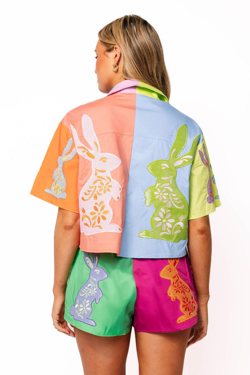 Queen of Sparkles Colorblock Easter Bunny Short Sleeve Top