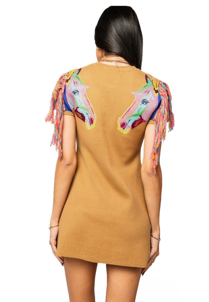 Queen of Sparkles-Tan Fringe Horse Head Button Up Knit Dress