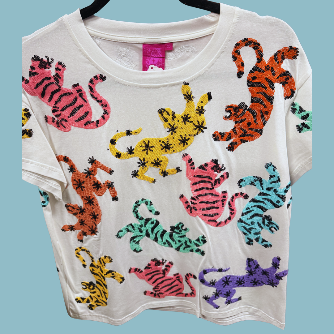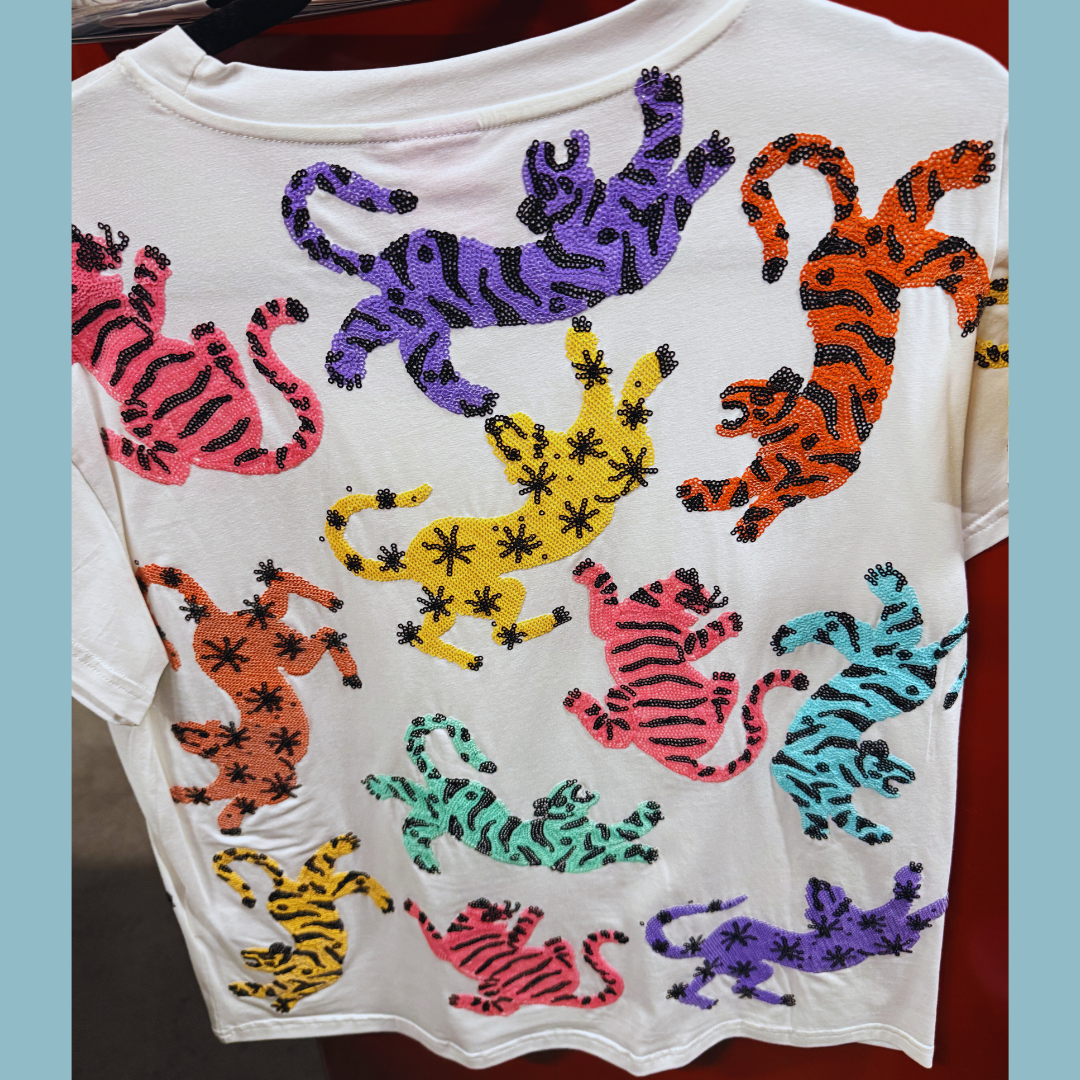 Make a bold statement in this Queen of Sparkles Crawling Tigers T-Shirt. Featuring vibrant, sequined multi-colored tigers crawling across the front and back, this white tee delivers eye-catching sparkle and attitude. The roomy fit ensures comfort and easy movement, perfect for standing out in any crowd.