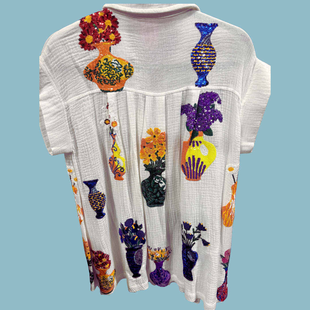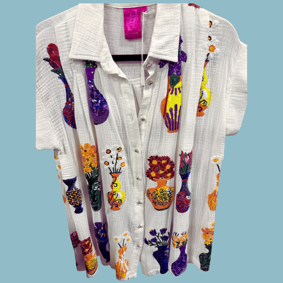 Effortless elegance meets playful style with this Queen of Sparkles Flower Vases Gauze Dress. Crafted from lightweight gauze, it's the perfect cover-up or standalone piece for warm-weather days. The crisp white silhouette features a classic collar and eye-catching blingy buttons that catch the light beautifully. Vibrant floral vase prints adorn both the front and back, adding a fun, flirty touch perfect for spring and summer adventures. Versatile, comfortable, and undeniably charming—your new go-to dress for any occasion.