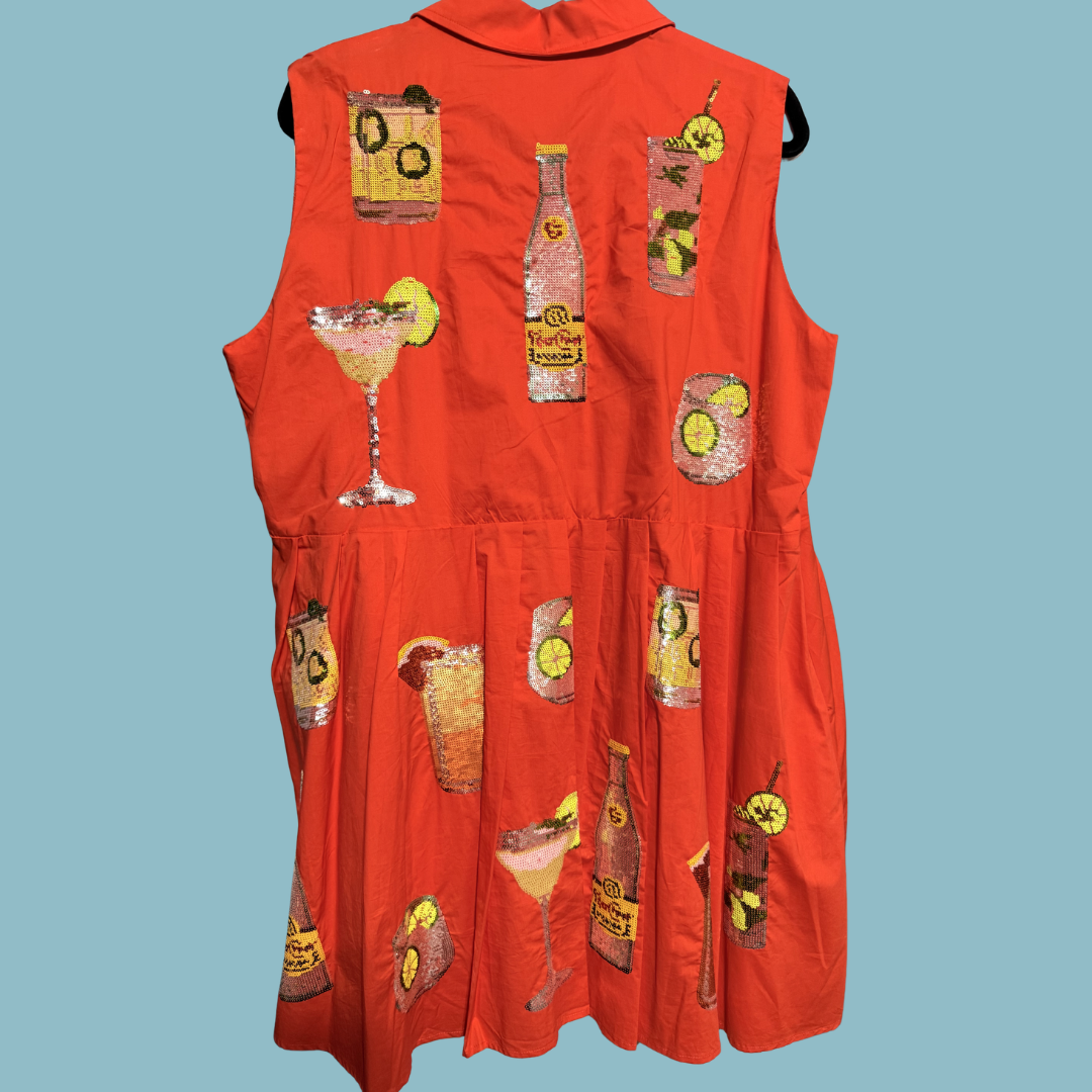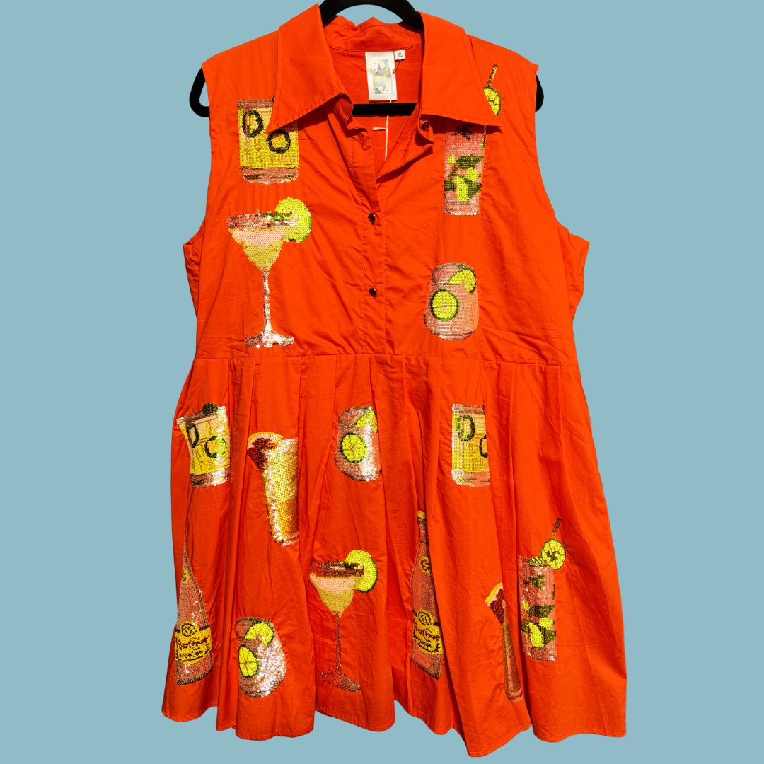 Celebrate in style with this vibrant orange sleeveless dress, perfect for any festive occasion. The loose-fit, lightweight fabric ensures all-day comfort, while the button-down collar adds a touch of sophistication. Adorned with eye-catching sequin tequila embellishments, this dress features practical pockets and a fully lined interior for a polished look. Hand wash inside-out to preserve the sparkle and keep your statement piece looking fresh. Final sale item.