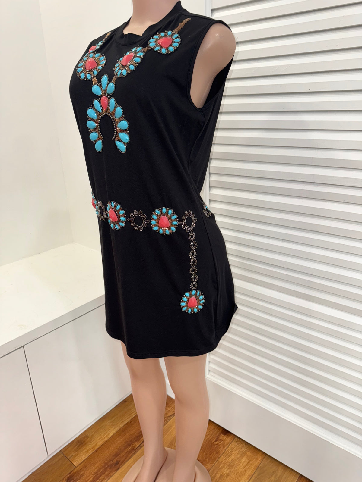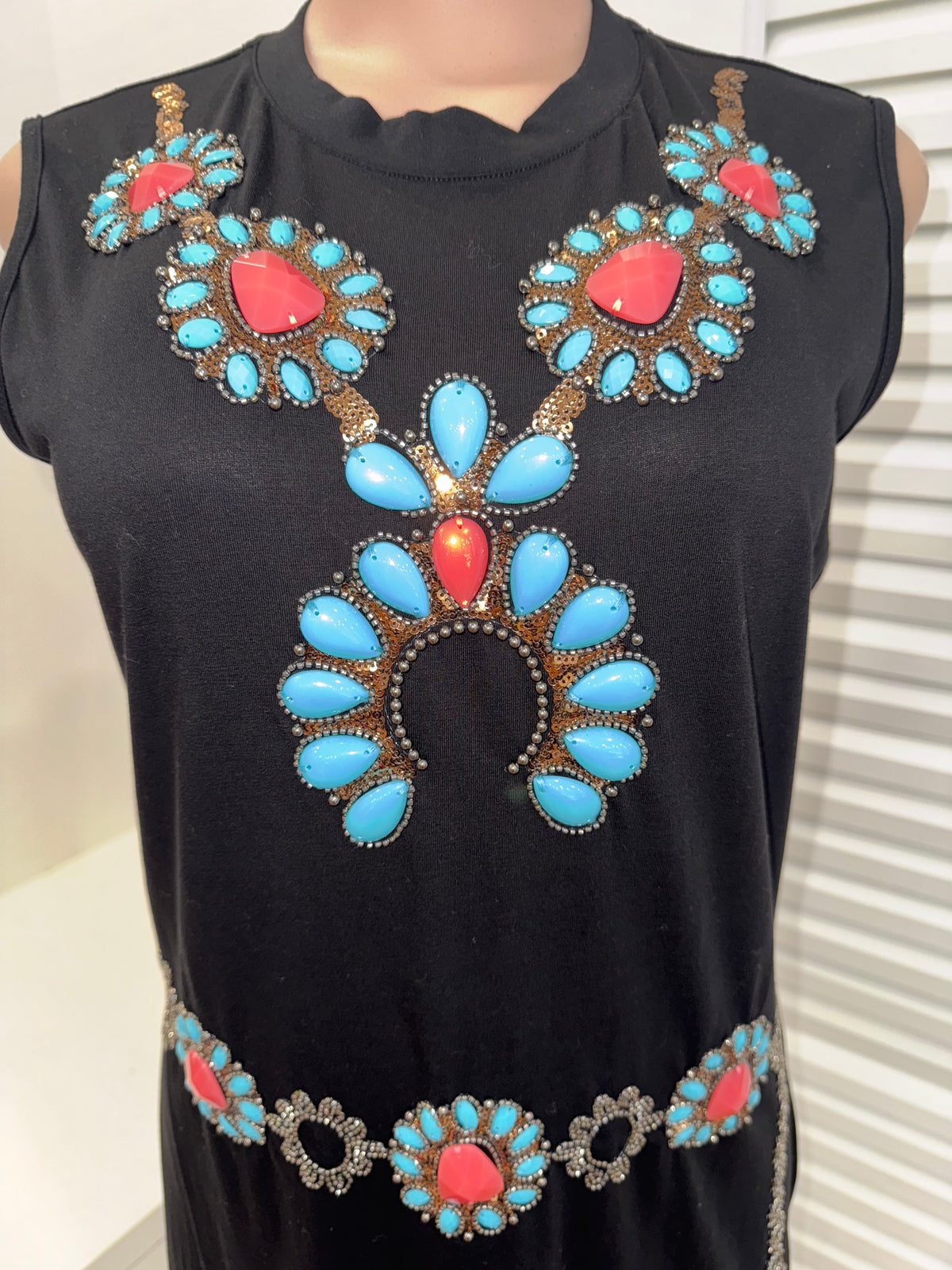 Be the queen of the Rodeo in this fun and flirty black sleeveless dress with Western Squash Blossom Necklace and Belt details. Perfect for Rodeo or Western Chic events.